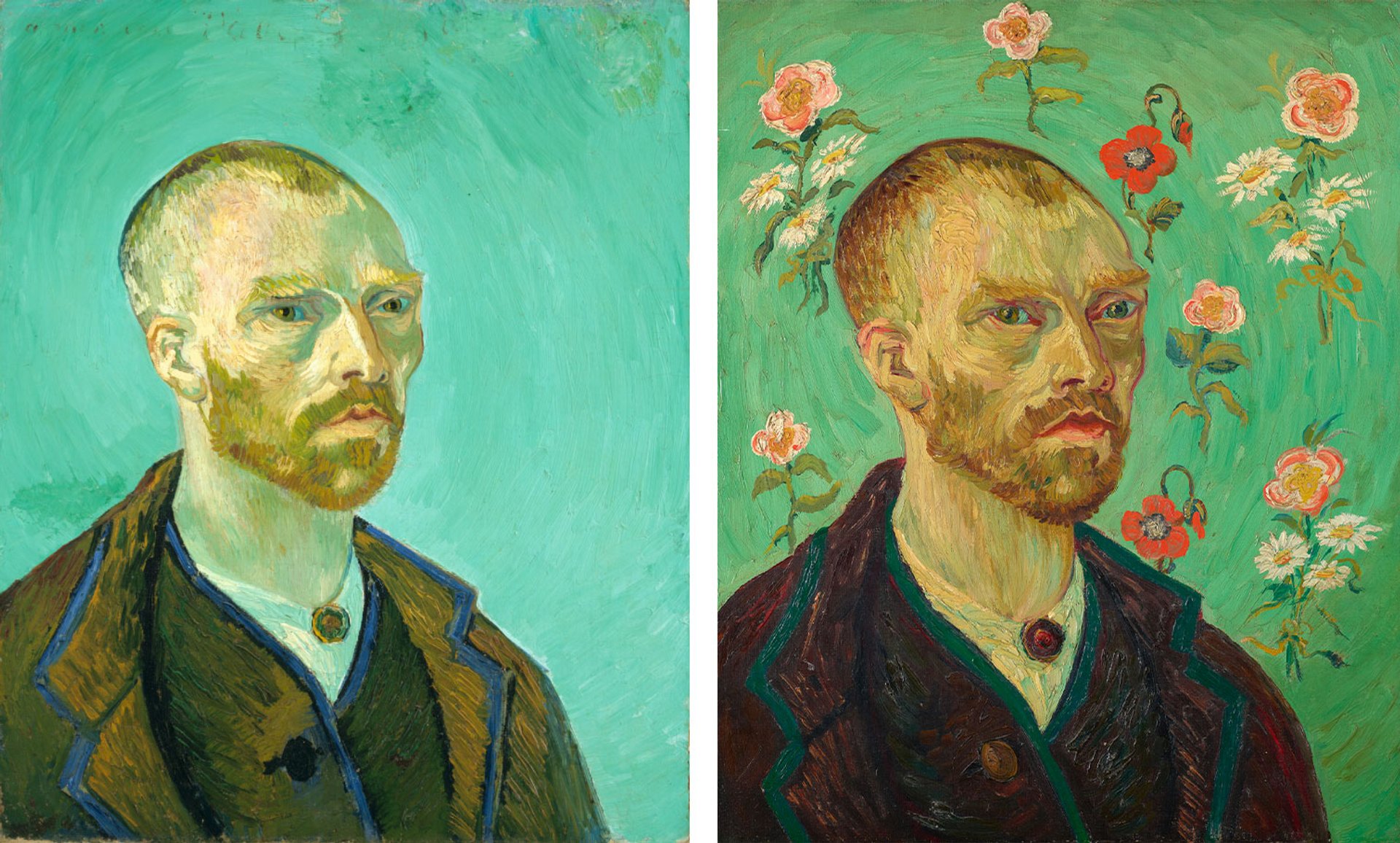 Gérard’s painting changed hands four years later, and was then modified by someone else, probably the French artist Emile Schuffenecker, who overpainted her signature and added the floral background. It was later deceitfully sold as a Van Gogh.